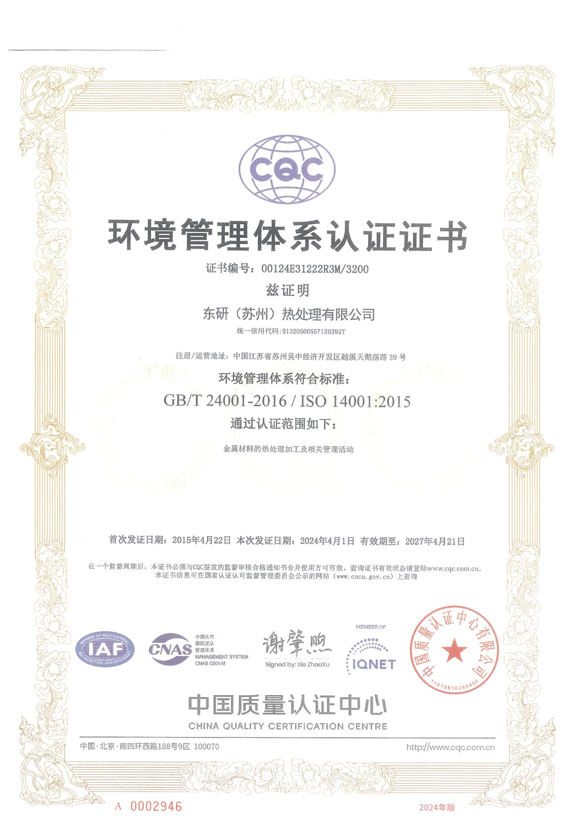 取得ISO14001:2015版升级认证